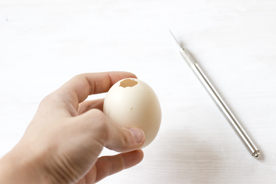 First of all we need to make the holes of the egg shells bigger. Tap with the scalpel around the little hole and make it on one side just a little bit smaller than the metal part of the wicks. Make the hole on the top of the egg about the same size. The bigger it is, the easier it is to pour the wax in – the smaller it is, the better the egg shape turns out. So it’s all about the balance.