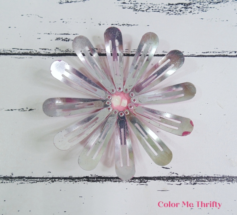 STEP ONE: Do a dry fit of the barrettes that you want to use. I’m using 12 barrettes for a nice full flower, and I decided to mix solid with pattern for this flower for some added interest.