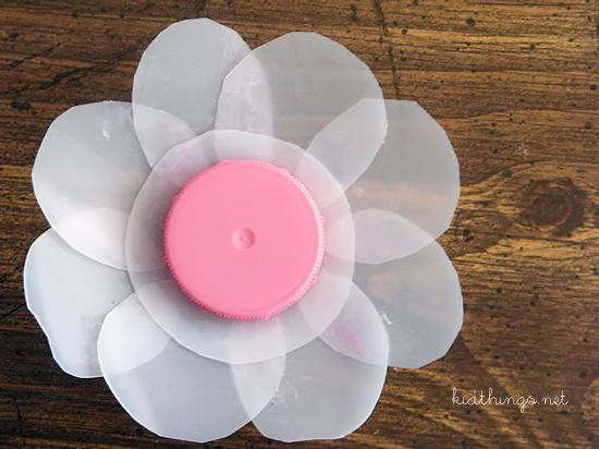 Glue petals onto the larger milk jug circle as well as the milk top with the liquid glue. Give these a bit of time to dry completely, then slide skewer through hole.