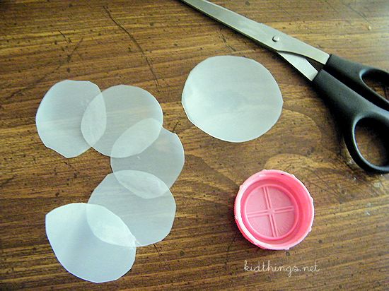 Then, cut out a larger circle for the petals and milk top to glue against. Punch a tiny hole in the middle of this piece for the skewer to slide through.