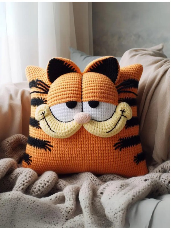 The Crochet Garfield Pillow is a soft and cuddly tribute to the beloved cartoon cat. Made with warm, fuzzy yarn, this pillow features Garfield's iconic orange and black fur, as well as his signature lazy expression. The intricate crochet work brings out the details of Garfield's face and body, making it a must-have for any Garfield fan. The pillow is perfect for snuggling up on the couch or as a fun addition to a home office or nursery. With its bright colors and endearing design, this pillow is sure to bring a smile to anyone's face.