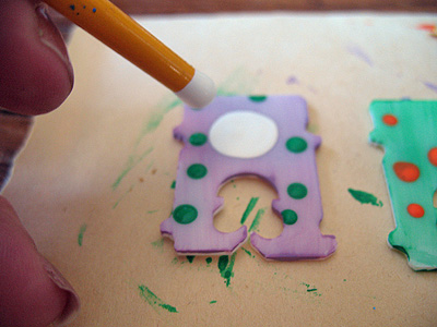 I dipped the handle end of a paintbrush into the paint to make the eyes and any polka dots. For really tiny polka dots and some of the pupils I used a toothpick.