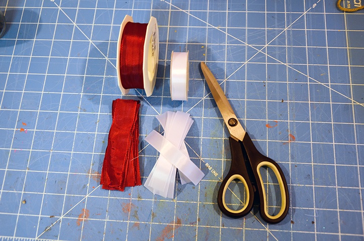 Cut 8 4" strips from one ribbon. Cut the same amount of ribbon strips from another ribbon color.