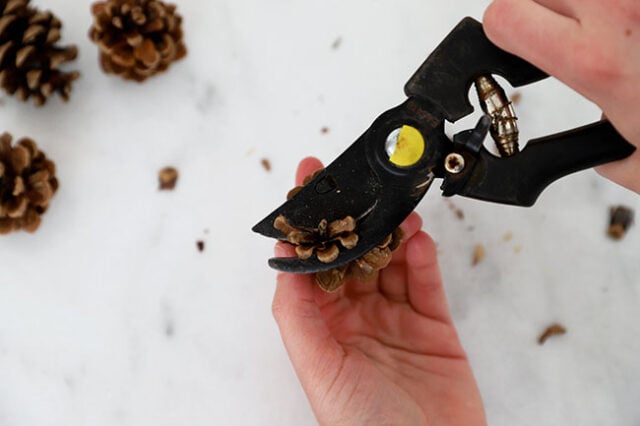 We strongly recommend using garden snips for cutting the pine cones. Depending on your pine cone and your scissors, you may be able to make it work with scissors, but we found they weren’t nearly strong enough to cut through the pine cone.