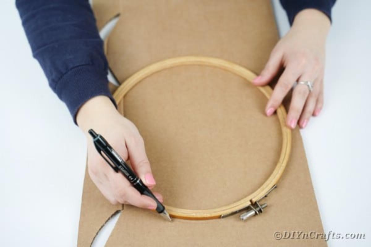 Begin by using a circle (hoop or similar) to trace and measure a wreath shape onto cardboard.